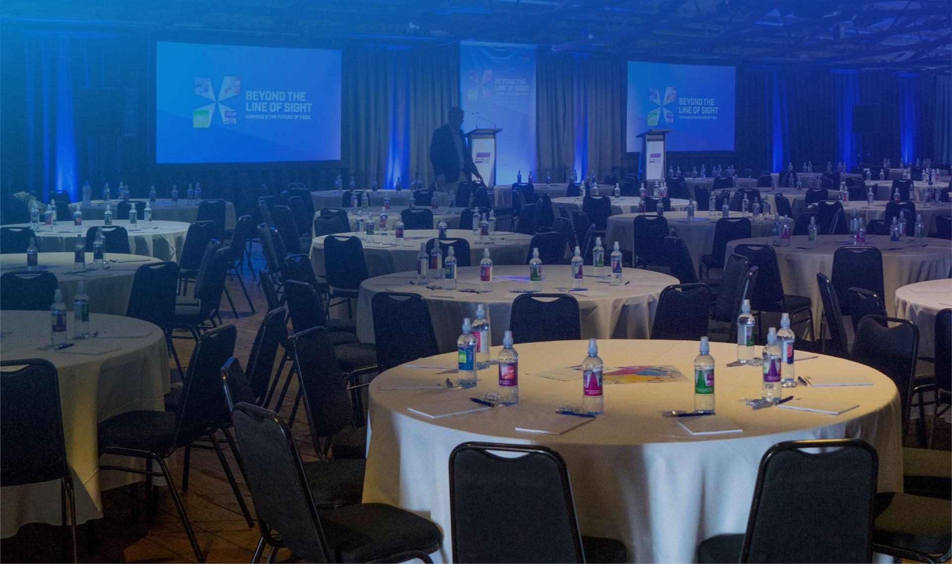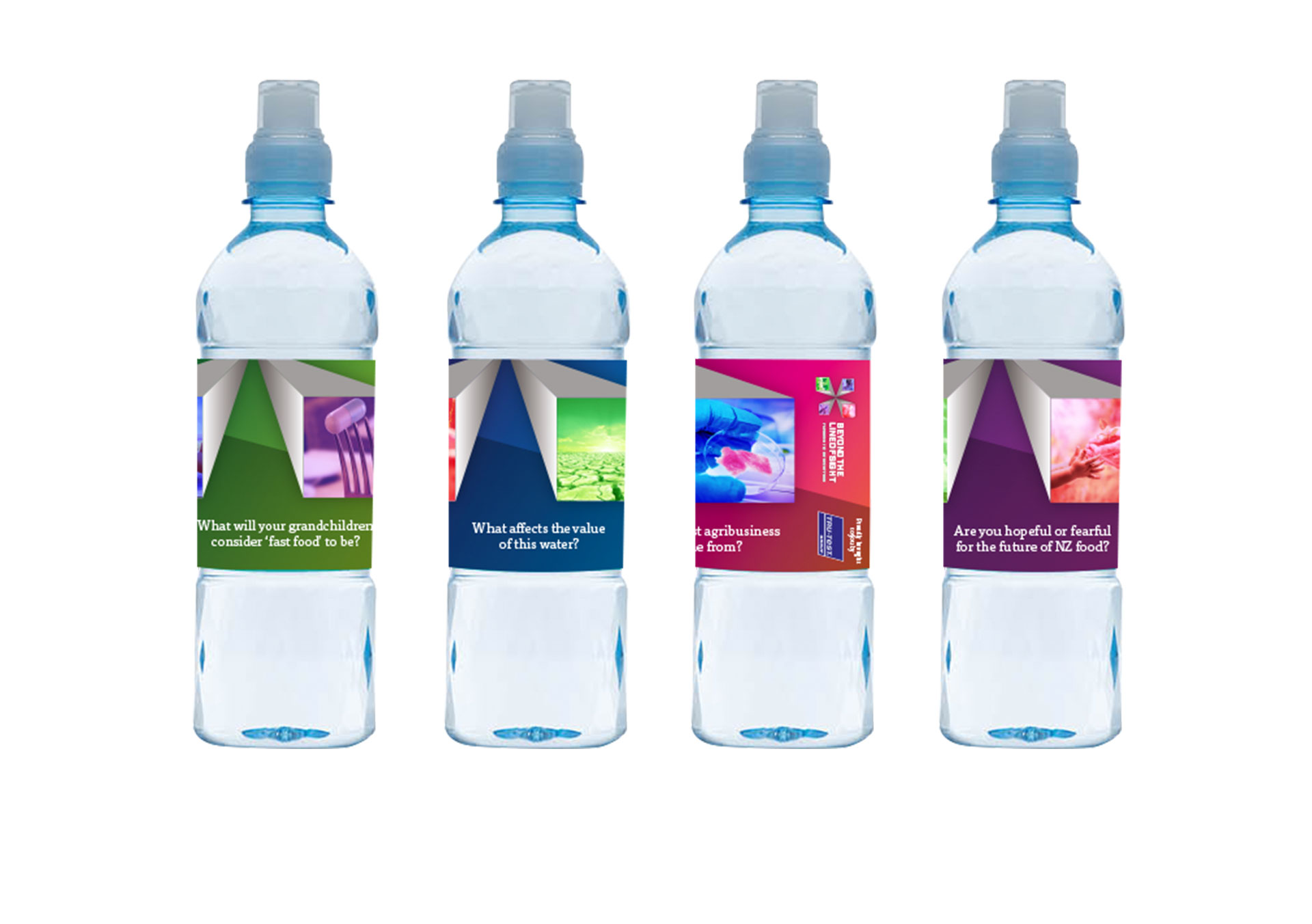 Signage, motion graphics and other collateral were also produced for the event. One such element, the water bottles, had conversation sparking questions such as "What will your grandchildren consider to be junk food?" printed on the side of them.