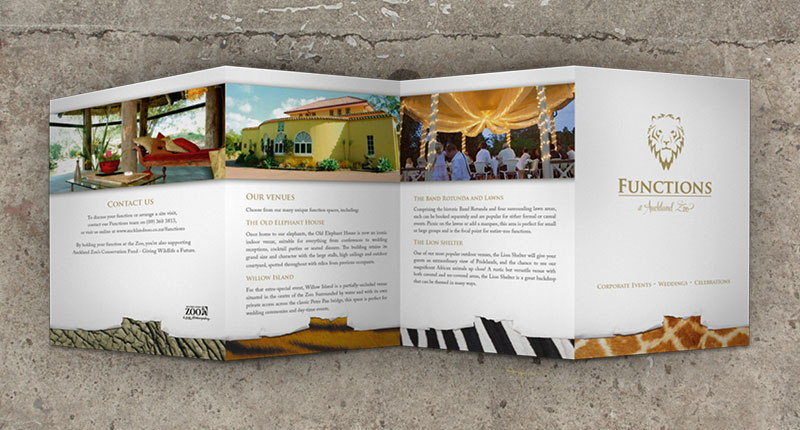 I was asked to develop a logo and other branding material to be used in promoting Auckland Zoo’s function venues. The material had to be clean and corporate, while still communicating the fact that it was part of a zoo.